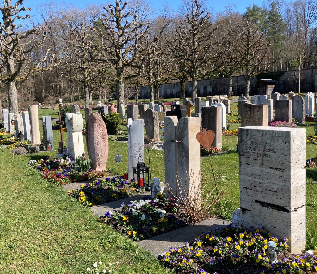 Bern’s Schosshalde cemetery, a hilly expanse of grass, trees, flowering shrubs and pansies shaded by gravestones, is perfect for a quiet spring walk. A place of peace, with intimations of eternal rest.