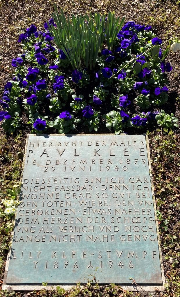 The Schosshaldenfriedhof is set on the side of a hill. At the top of this hill is the grave of painter and Bauhaus teacher Paul Klee. The rest of the cemetery spreads out from Klee’s burial place in three directions. To the northeast there’s a small woods where urns have been buried along a narrow path winding among the trees. Paved walkways pass fields of graves placed in typical rows, but there are also little groves with scattered gravestones half-hidden by bushes. Near a pond with benches, there’s even a small outdoor “museum,” where particularly attractive or interesting gravestones from all three of Bern’s cemeteries are displayed. When graves are destroyed every twenty years, their stones are usually ground down to gravel; this exhibit shows a few sample gravestones from each decade since 1878, when the cemetery buried its first coffin.