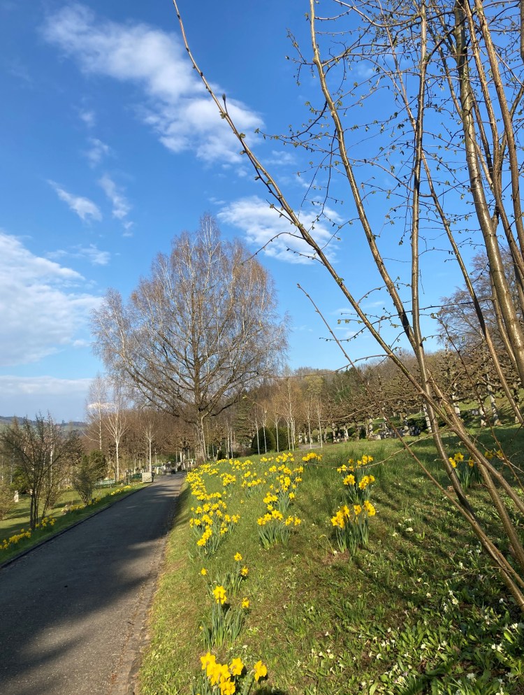At the risk of seeming morbid, I wanted to return to my favorite place for walks, the Schosshalde Cemetery. On March 30th, I wrote about how most Swiss graves last for only twenty years, before they are filled with another generation’s coffins and urns. But I didn’t tell you how beautifully tended those temporary graves are.