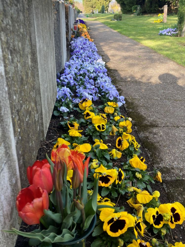 Since the beautifully tended flowers are what I enjoy most about the graveyard, I was amazed to discover from its director, Simon Zwygart, that only fifty percent of the gravesites are planted and cared for by the cemetery’s gardeners; the rest are the responsibility of family members. Yet I rarely see a grave that looks abandoned. Herr Zwygart explained that when a grave which is supposed to be tended goes too long without care, the family is contacted. If no one shows up to deal with the problem or decides to pay the cemetery to do it, the site will be planted over with grass or an attractive ground cover. “Of course even if someone hasn’t hired us to be responsible for a grave, we still weed, water and trim the plants free of charge,” Herr Zwygart assured me.