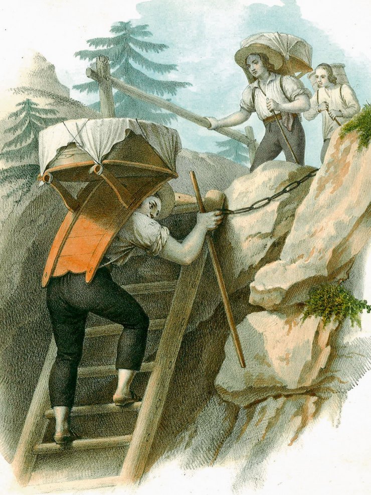 For centuries the Senner or Sennerinnen were crucial to the production of cheese. These herdsmen or herdswomen drove the cows up to the Alpine meadows in the spring and brought them down again in the fall, living in the meantime all summer in the mountains with their animals. Every morning and evening the cows were gathered in and milked, and then, before the milk could spoil, it had to be made into cheese. During their months on the Alp, the herders lived on milk, cheese, butter, fresh curds and whatever dried provisions they’d been able to bring with them. At the end of the summer, the great wheels of cheese they’d made were brought down from the Alp on the herders’ backs, fastened to a wooden contraption called a Räf.