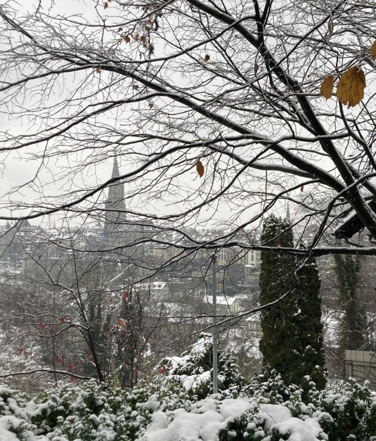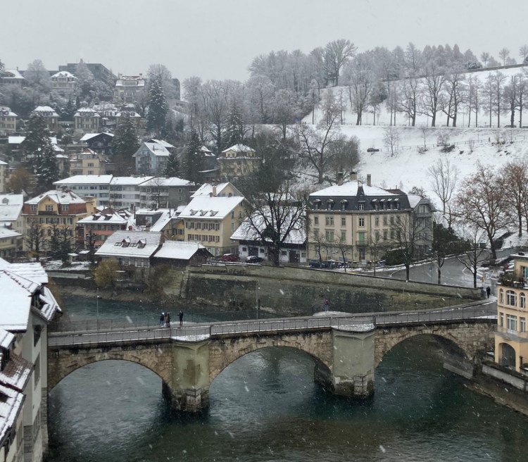 On Saturday I walked across Bern’s encircling river, the Aare, from the Old Town to the top of the hill that leads to home. It was snowing, but only lightly, and all the colors around me were muted under the gray sky. As I crossed the Nydegg Bridge, I couldn’t help noticing, yet again, how beautiful my city is. Even without sun and blue skies and window boxes full of flowers, it’s magnificent.
