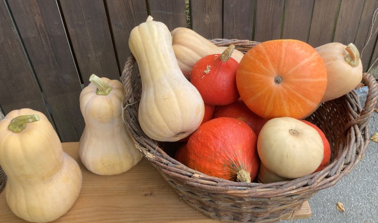 Photo credits: The photo of pumpkins at the Hodel farm in Vechigen is from their website; I found the sunflower picture on Pexels, and Julissa Helmuth took it. The Hokkaido photo is from Plantura Magazine (UK) , where it’s credited to Lubos Chlubny/ Shutterstock. The other two photos are mine, one of Bern’s big farmers’ market in the center of town and the other of a small farm stand near our apartment.