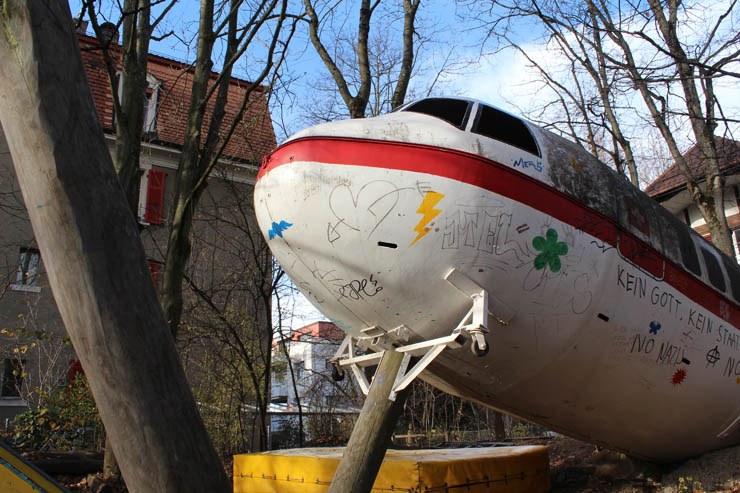 The Schützenweg playground isn’t about anything as serious as survival; it’s about having fun. Still, playing there can teach self-reliance and courage. I remember my seven-year-old son’s face as he stood at the door of the airplane’s cockpit, steeling himself to jump eight feet to the mat below. Then he did it, rolled across the mat, leaped up laughing, and did it over and over again.