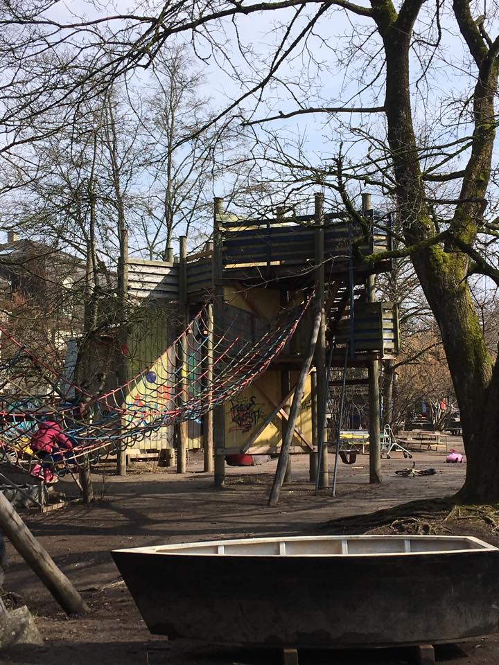 About half the size of a city block, the fenced-in Schützenweg playground looks like a junkyard to adults and a paradise to children. Rickety chairs, tables, and benches in all colors, some shaded by large trees, are scattered around the lot, along with tricycles, pedal cars, an old wheelchair, and several Dr. Suess-looking vehicles just the right size for under-fives. Water dripping continuously from a pipe trickles into a high-sided trough, down a long, hand-built stone channel, and into one corner of an enormous sandbox full of buckets, shovels, and toy bulldozers. Nearby is a 25-foot dirt hill scattered with small bushes and clumps of grass. Only by clambering up a series of rocks and climbing a wooden tower can a child reach the top of the hill’s long, curving slide. There are swings on exceptionally long chains and climbing nets made of thick rope, stretched vertically and horizontally to give access to a treehouse or to brightly painted platforms and huts high above the ground.