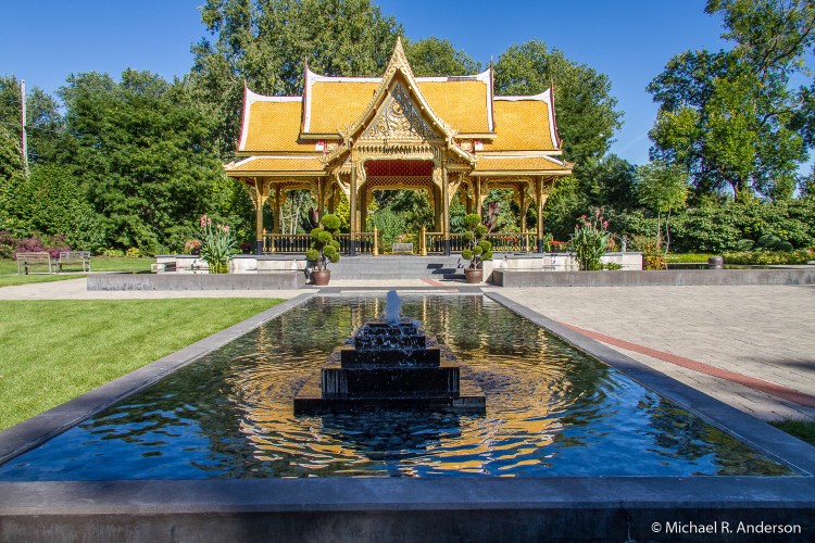 Madison is a university city—a fifth of its total population of 284,000 consists of undergraduates and graduate students. Although the mean temperature in January is -11°F (-24°C), it’s a welcoming place, full of lakes and attractive buildings, including several designed by Frank Lloyd Wright. It’s also home to the Olbrich Botanical Gardens, which display a feast of seasonal flowers, shrubs, and trees and, in one corner, the Royal Thai Pavilion. Covered with gold leaf, the pavilion was an unexpected gift to the University of Wisconsin-Madison from its Thai alums and the Thai government, approved by the Royal Family. There is nothing else like it in the continental US. The building was built from scratch in Thailand, then disassembled and crated for transport. For seven weeks, it traveled by boat, train, and truck to Madison, where nine Thai artisans arrived to reconstruct it. It’s set on a pond amid lush greenery and brightly colored flowers, and I found it an astonishing sight.