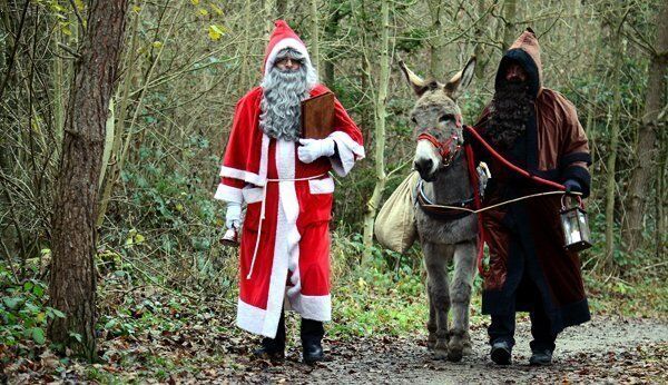 Switzerland’s Samichlaus has white hair and a long white beard, carries a book and a large sack, and wears a red robe trimmed with white fur, sometimes with a waist-length cape over his shoulders. In Bern, he wears the fur-trimmed hood of his robe over his head, while in other cantons (especially the predominantly Roman Catholic ones), he wears a bishop’s mitre and carries a crook. Instead of flying around Switzerland in a sled pulled by reindeer, Samichlaus rides through the forest on a donkey, and he is assisted not by elves but by Schmutzli, a demonic figure with a long brown beard who wears a brown monk’s robe. Originally, Schmutzli’s job was threatening to carry bad children away to hell, but he is a much reformed character in this era of gentler parenting!