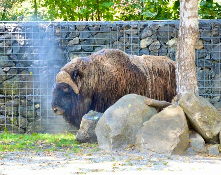 In the muskoxen’s enclosure that I visited, there’s a massive tree trunk hanging from a large tree. The older bull, Henk, used to charge it repeatedly and hit it with his head—practicing, I suppose, for when he’d have to drive other bulls away from his cows. I don’t think he had to deal with many challenges to his leadership in Bern. Maybe at the Musk Ox Center in Sweden, he will get to use his head-banging skills.
